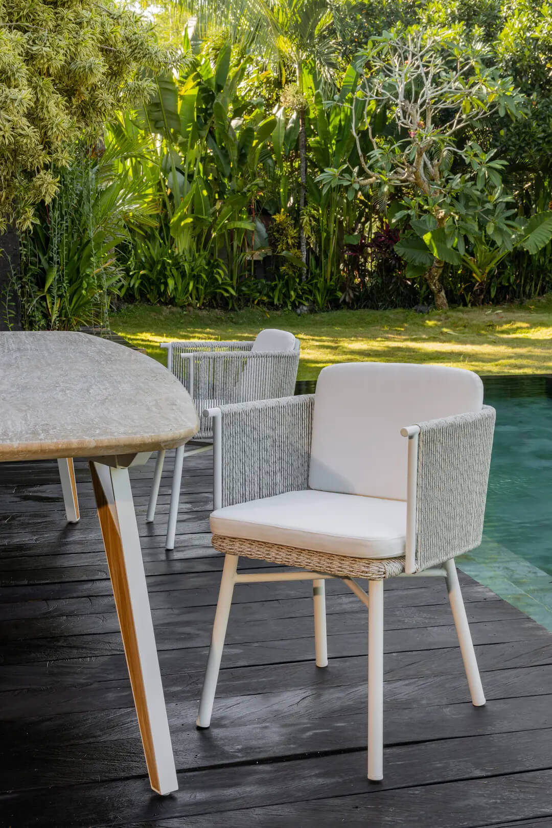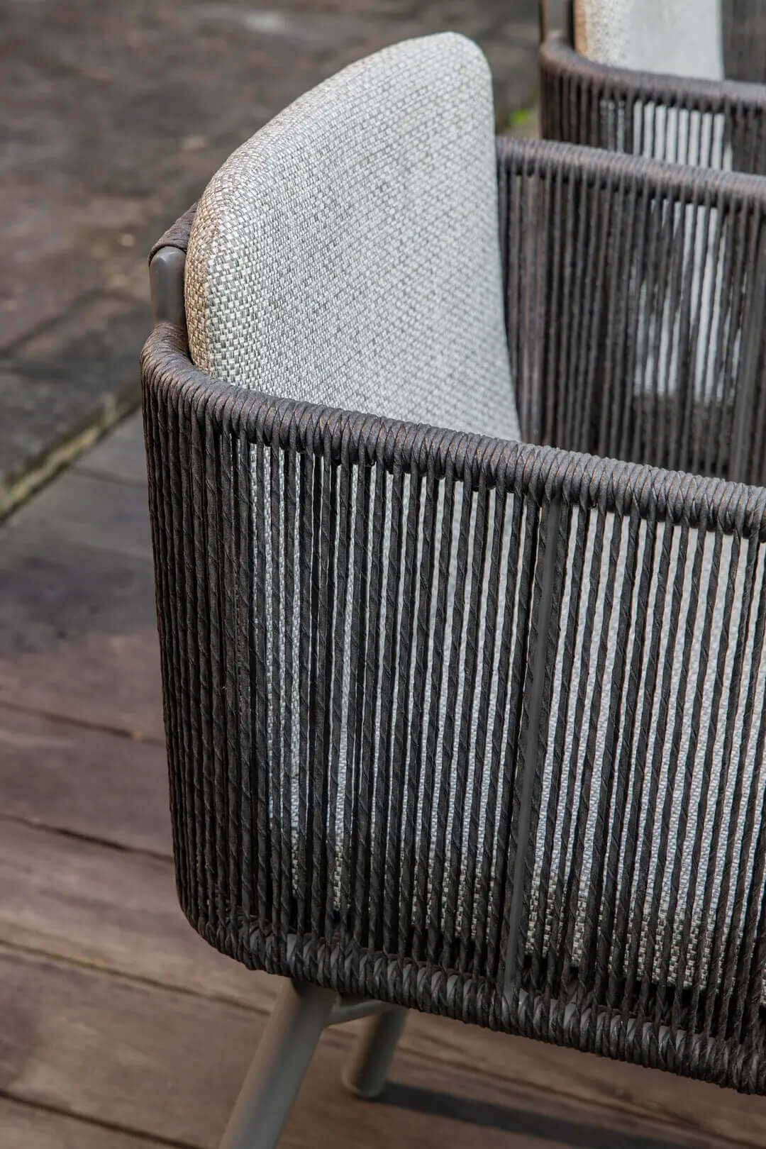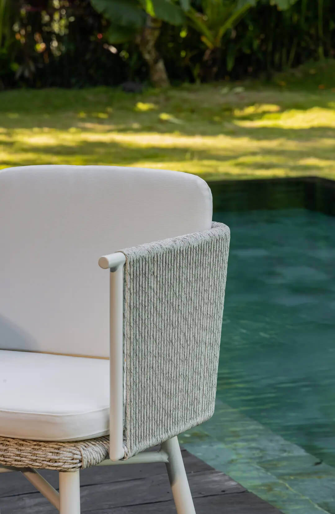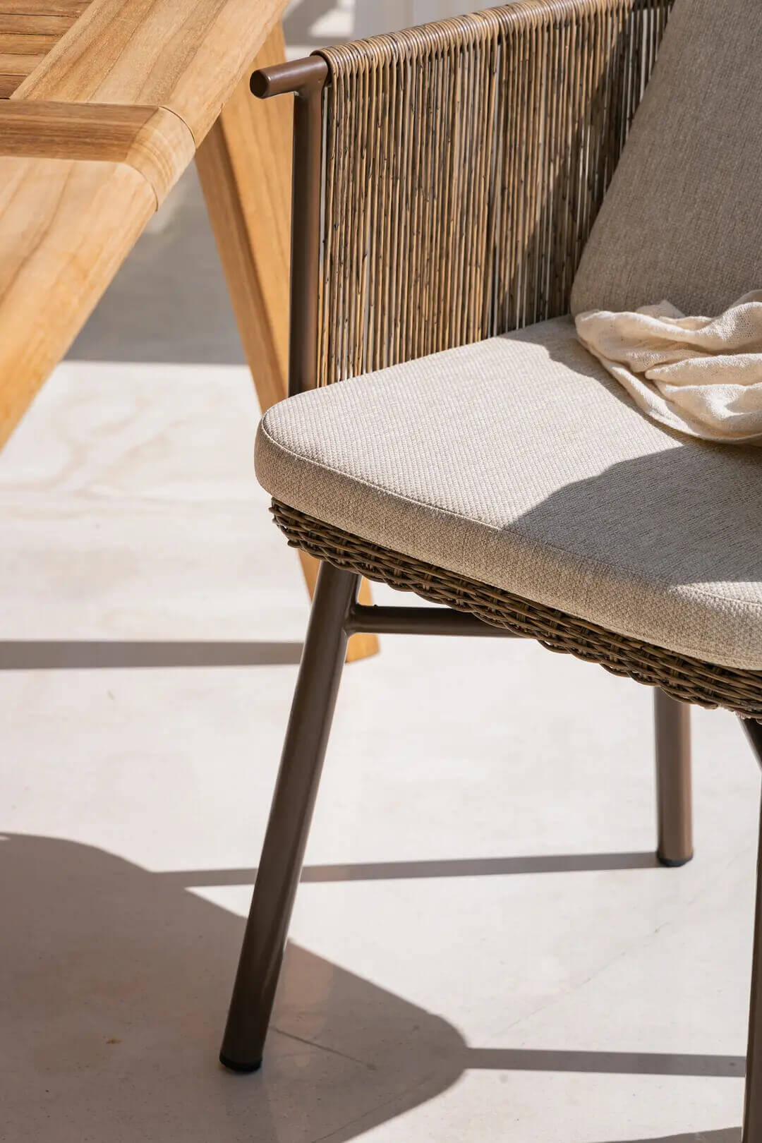 Its seat welcomes the user in a warm embrace. Kiki is an armchair distinguished by high, woven rope armrests. The cushion with its removable cover lends even more comfort to it.