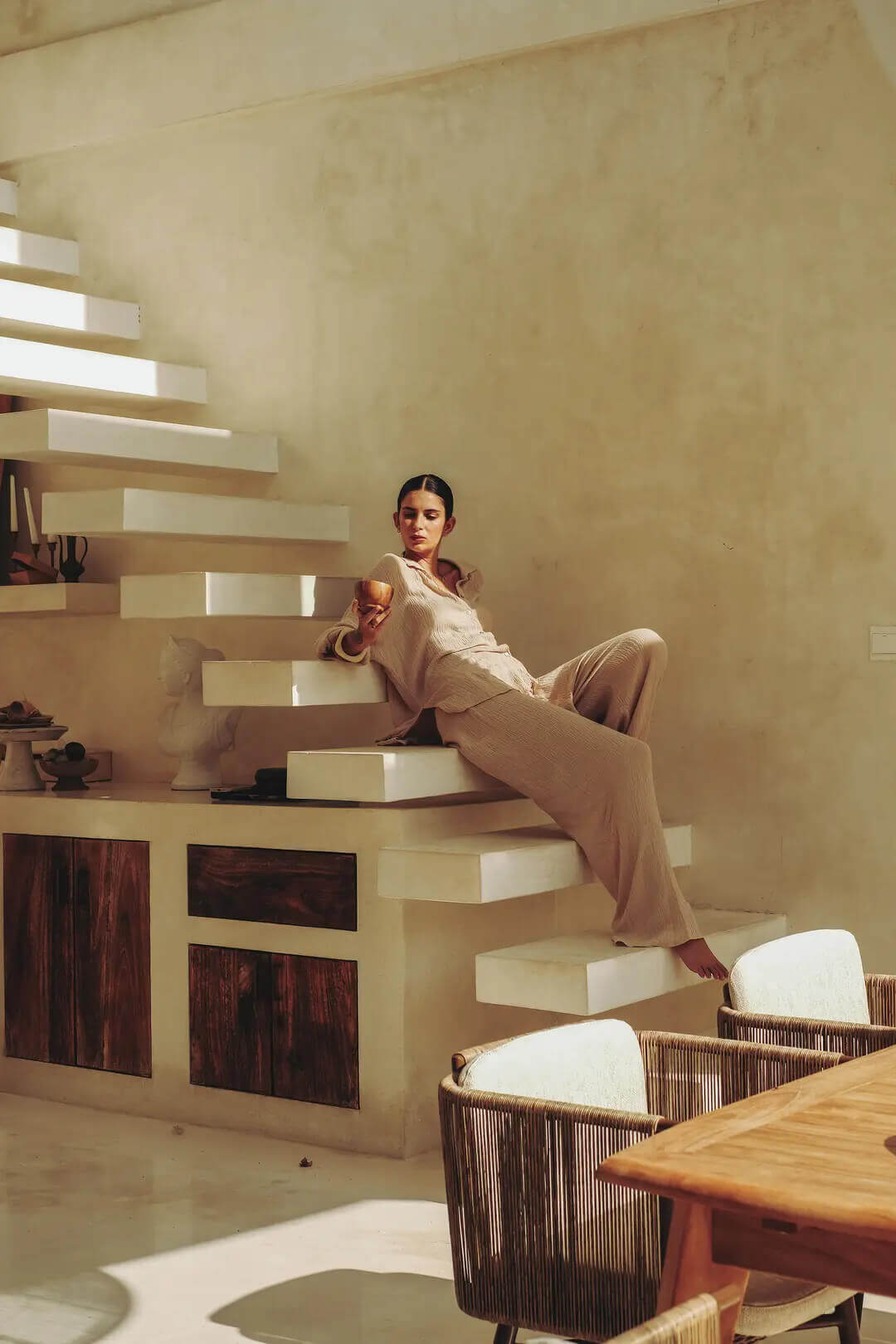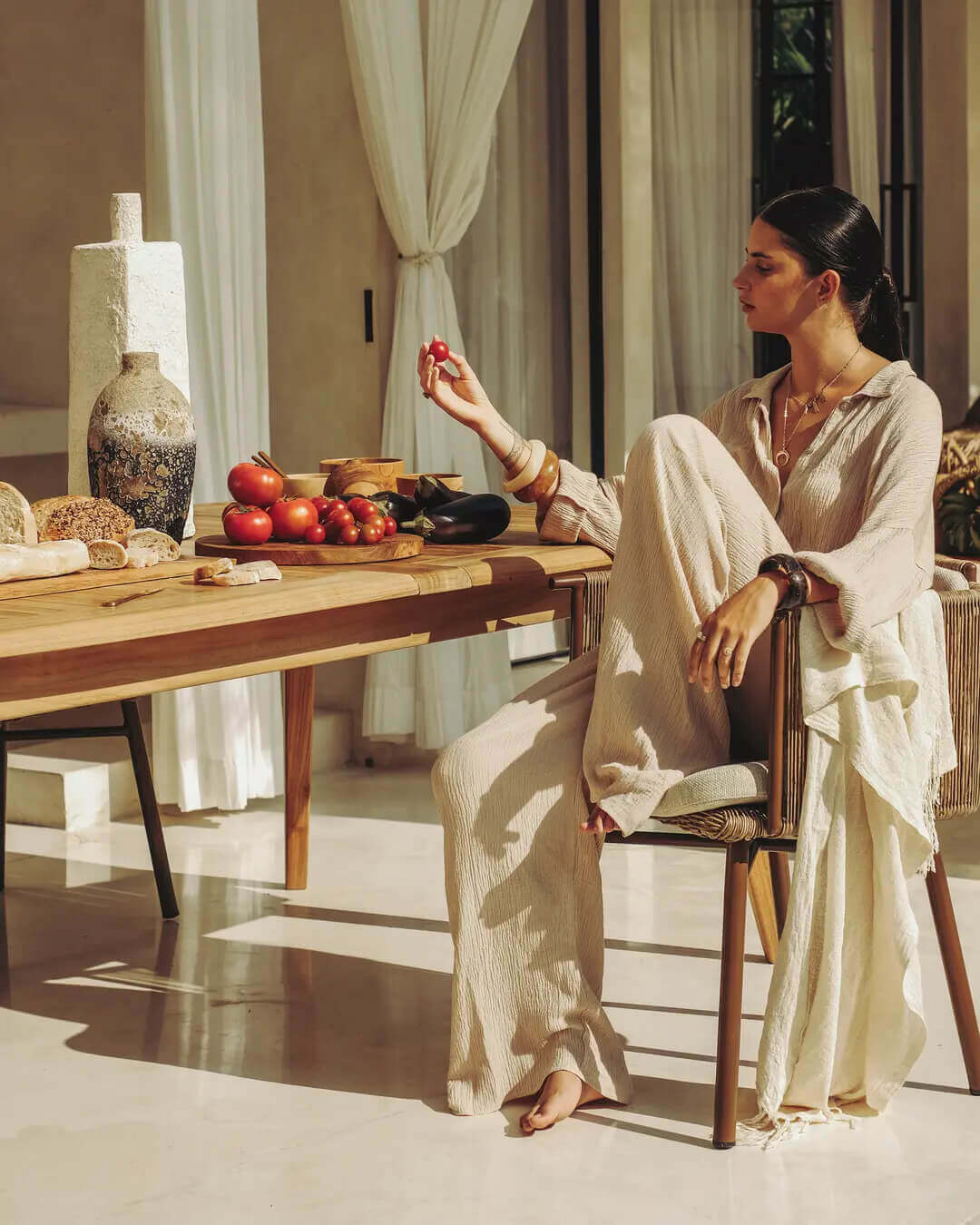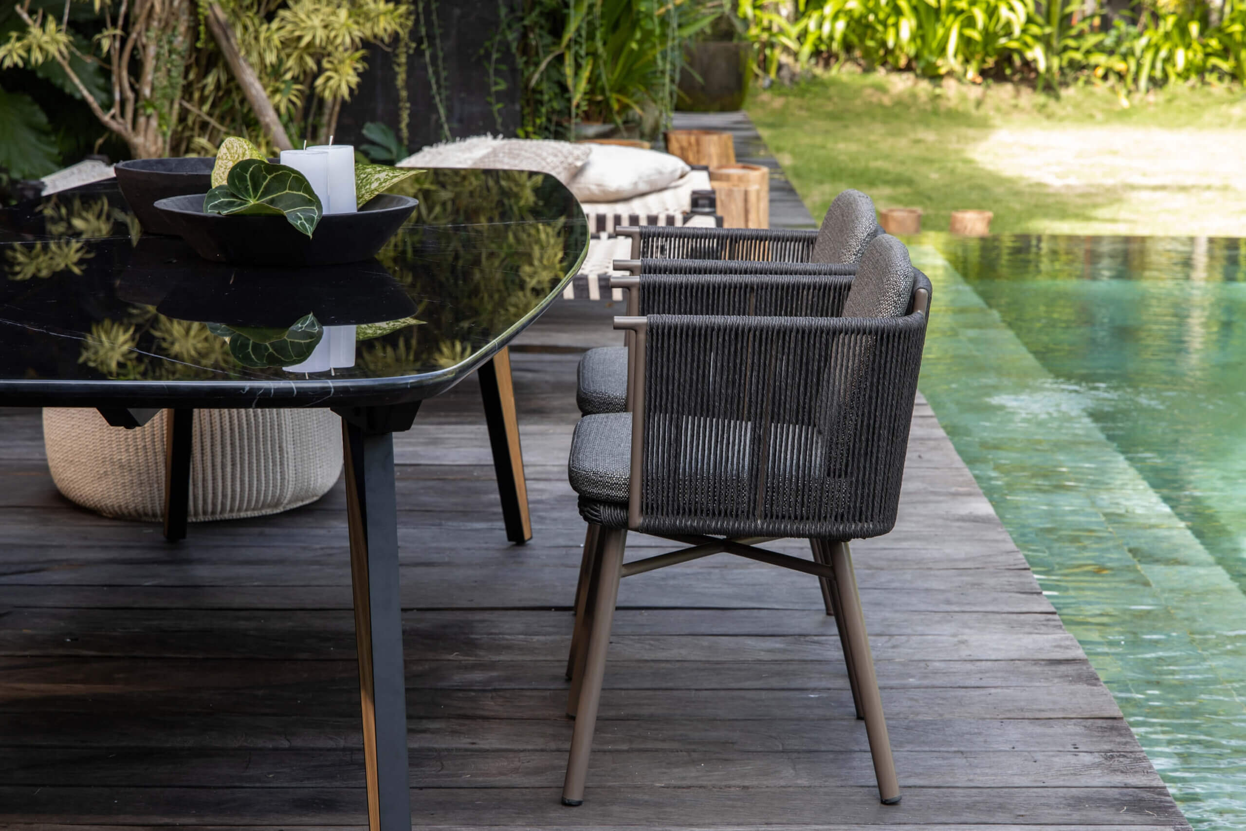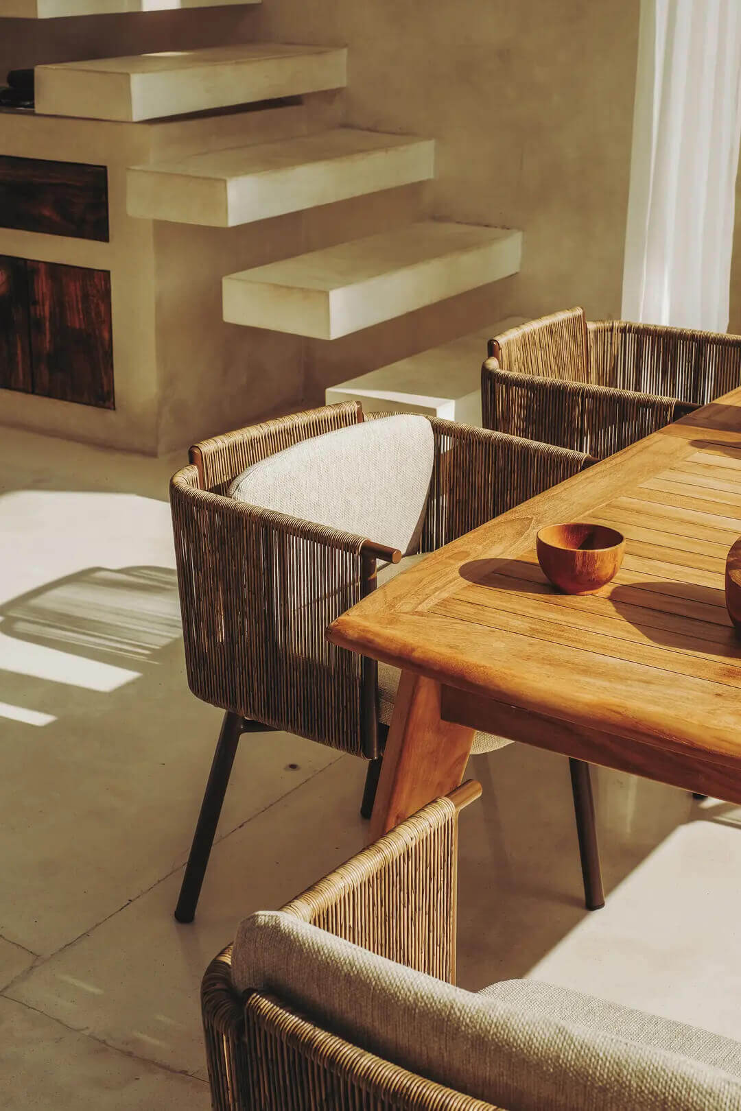 Its seat welcomes the user in a warm embrace. Kiki is an armchair distinguished by high, woven rope armrests. The cushion with its removable cover lends even more comfort to it.