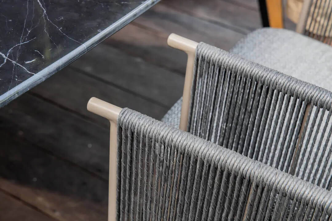 Dining chair made of 4.8mm twisted rope filaments which wrapping around the aluminum structure, meet and intertwine on the seat. Aluminum structure finished with epoxy powder.